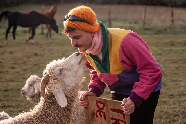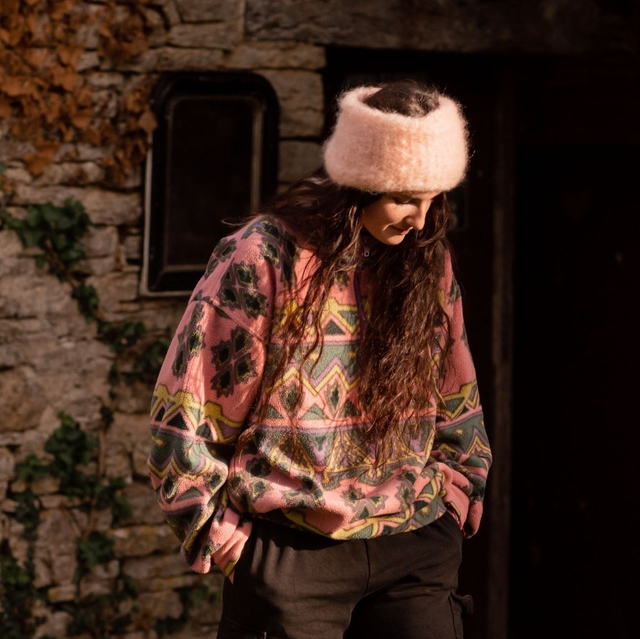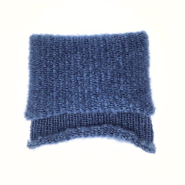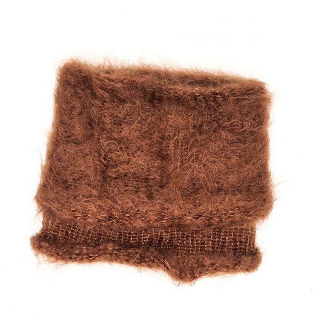 Tricoté à la ferme avec un fil raffiné mêlant 80 % mohair de chevreau et 20 % de soie, il allie douceur, légèreté et une brillance naturelle qui capte la lumière juste ce qu’il faut.